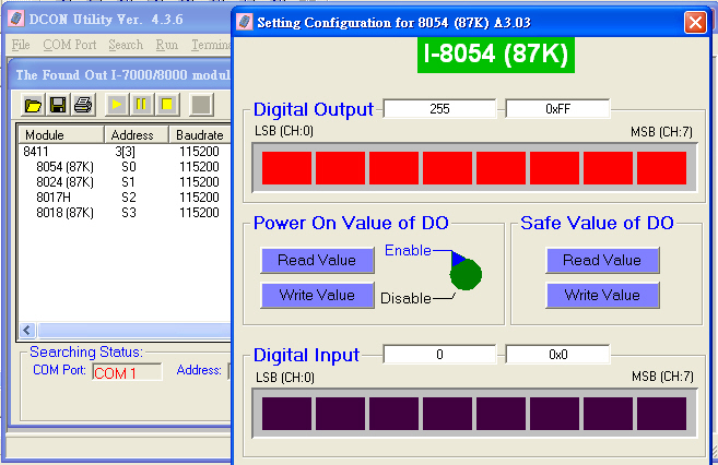 modules and test the I/O status via the serial port(RS-232/485) or ethernet port